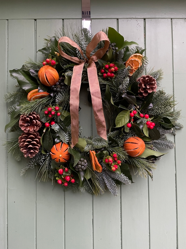 A beautiful hand made traditional festive door wreath filled with seasonal foliages, berries, oranges and cones.